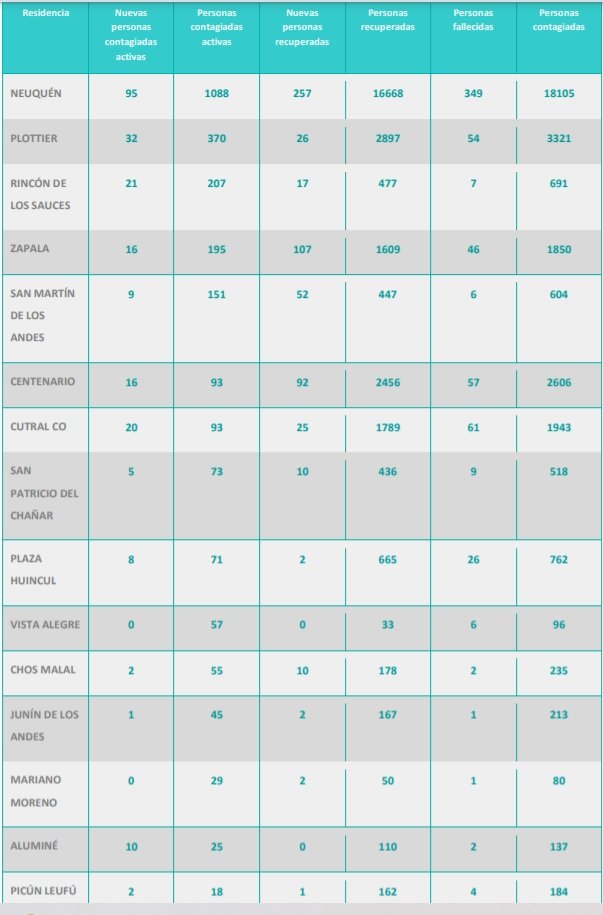 Además, se reportaron seiscientas trece (613) nuevas personas recuperadas de Coronavirus (COVID-19) de la provincia del Neuquén: 257 personas de Neuquén capital, 107 personas de Zapala, 92 personas de Centenario, 52 personas de San Martín de los Andes, 26 personas de Plottier, 25 personas de Cutral Co, 17 personas de Rincón de los Sauces, 10 personas de Chos Malal, 10 personas de San Patricio del Chañar, 4 personas de Senillosa, 2 personas de Plaza Huincul, 2 personas de Mariano Moreno, 2 personas de Junín de los Andes, 2 personas de Añelo, 1 persona de Piedra del Águila, 1 persona de Picún Leufú, 1 persona de Bajada del Agrio,