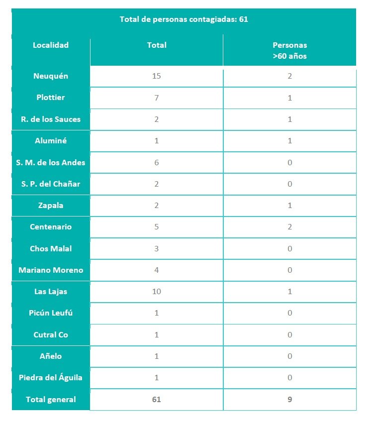 En tanto, se notificaron sesenta y una (61) nuevas personas contagiadas de Coronavirus (COVID-19) de la provincia del Neuquén.