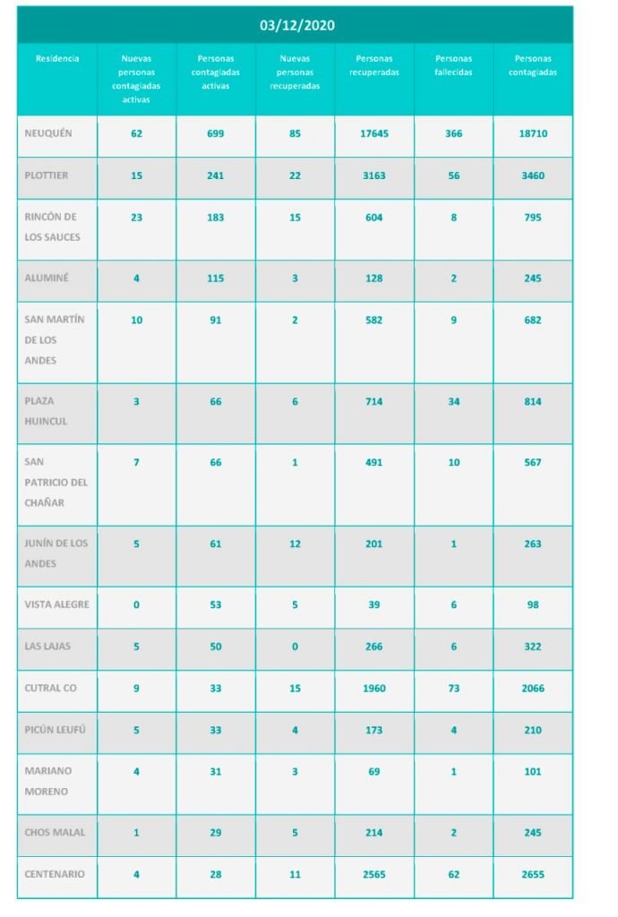 En cuanto a los casos confirmados se informó que fueron 3 los casos nuevos en Huincul y 9 en Cutral Co, 12 en total. Con estos datos hay 99 casos activos.