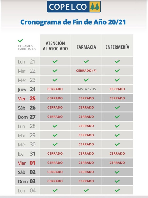 Desde la cooperativa Copelco, se informó el cronograma de atención en estas jornadas de fin de año. Es tanto para las oficinas como farmacia y enfermería.