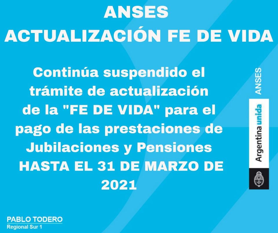 Desde el ANSES, a través de la Región Sur, se informó que jubilados, jubiladas, pensionadas y pensionados no tendrán que hacer el trámite de fe de vida hasta el 31 de marzo.