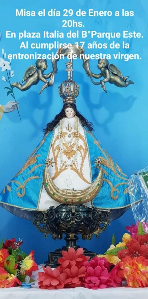 Este viernes 29, a las 20 se llevará adelante la celebración de la misa porque se cumplen 17 años de la entronización de la virgen San Juan de Los Lagos. Será en la plaza Italia del barrio Parque Este de Cutral Co.
