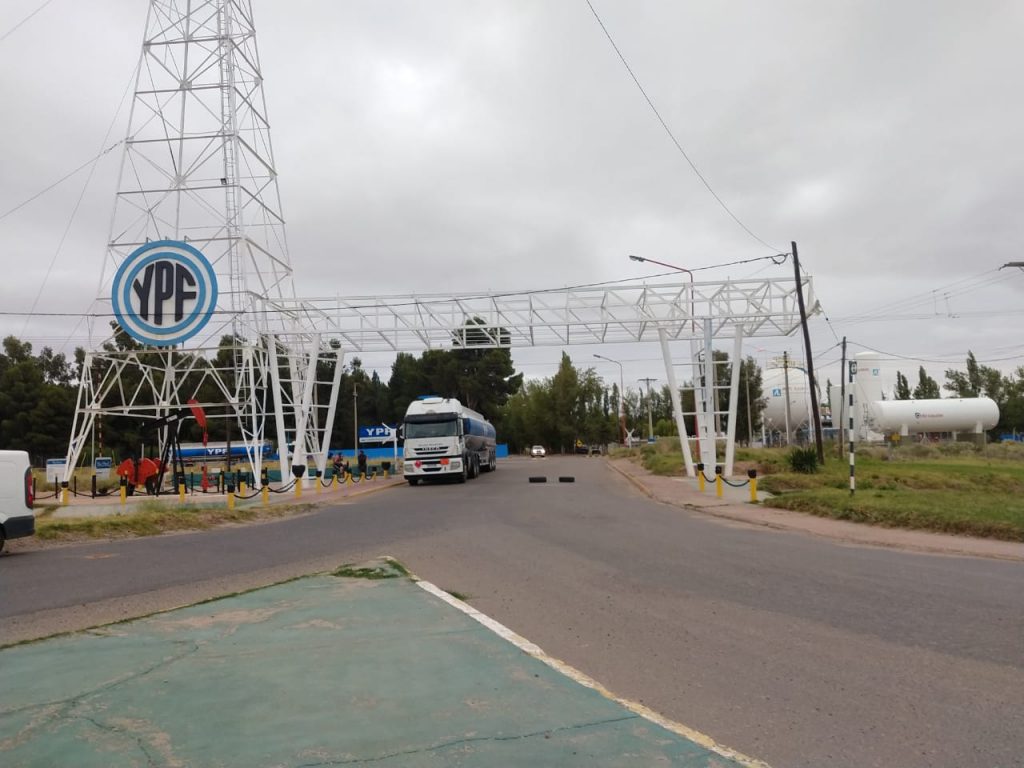 Un grupo de desocupados de la agrupación “20 de Junio” y otro integrantes en representación de capacitadores de Plaza Huincul cortan la ruta 22, frente a la torre de acceso a Plaza Huincul y a la destilería de YPF.