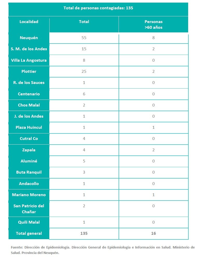 Se trata de cuatro casos en Cutral Co y uno en Plaza Huincul. En tanto, en la provincia, se registraron 135 nuevas personas con Covid-19 en total.