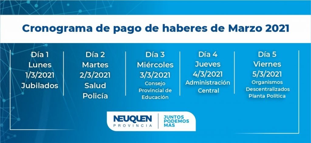 Se dio a conocer el cronograma de pago de los haberes que corresponden a marzo de 2021, y el lunes 1 de marzo, se inicia con los jubilados del Instituto de Seguridad Social de Neuquén.