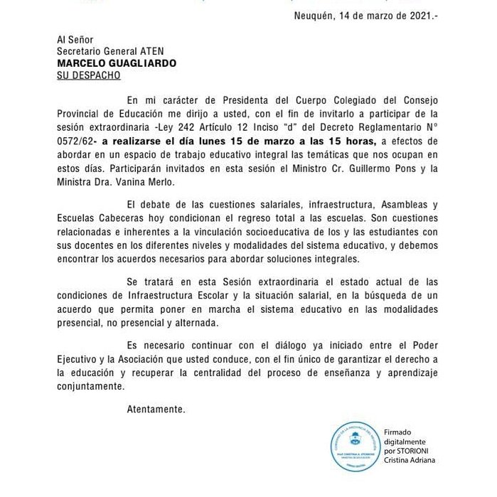 El llamado a la dirigencia gremial de los maestros fue hecha por la ministra de Educación, Cristina Storioni y será en la sede del Consejo Provincial de Educación. Además, asistirán los ministros de Economía, Guillermo Pons y de Gobierno, Vanina Merlo.