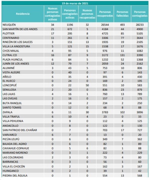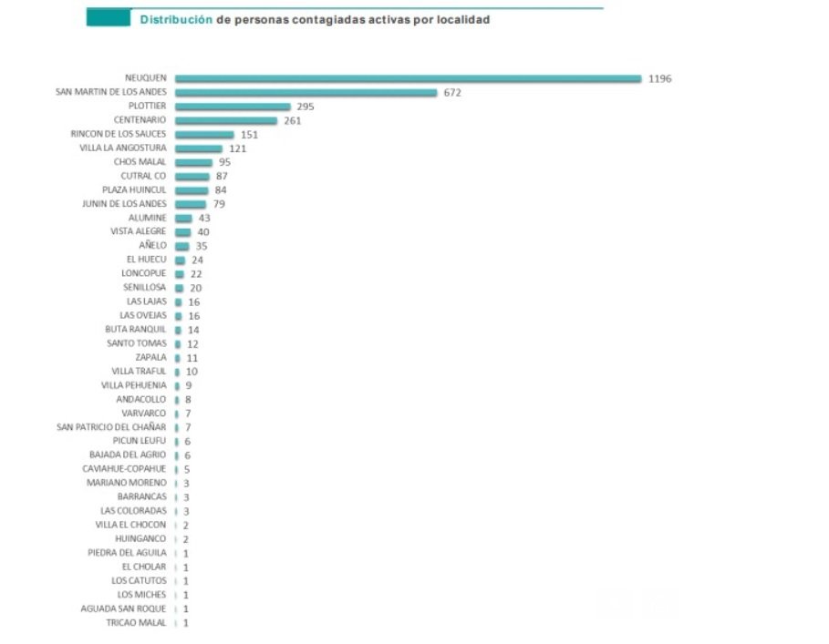 La víctima fatal es de Cutral Co. Los casos positivos son 16 cutralquenses y 6 huinculenses; mientras que los recuperados son 14 en total, nueve cutralquenses y 5 huinculenses. Los casos activos son 87 y 84 respectivamente, lo que totalizan 171.