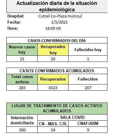 En total, los casos activos en Cutral Co y Plaza Huincul hay 297. La nómina de fallecidas continúa siendo de 207 en las dos ciudades.