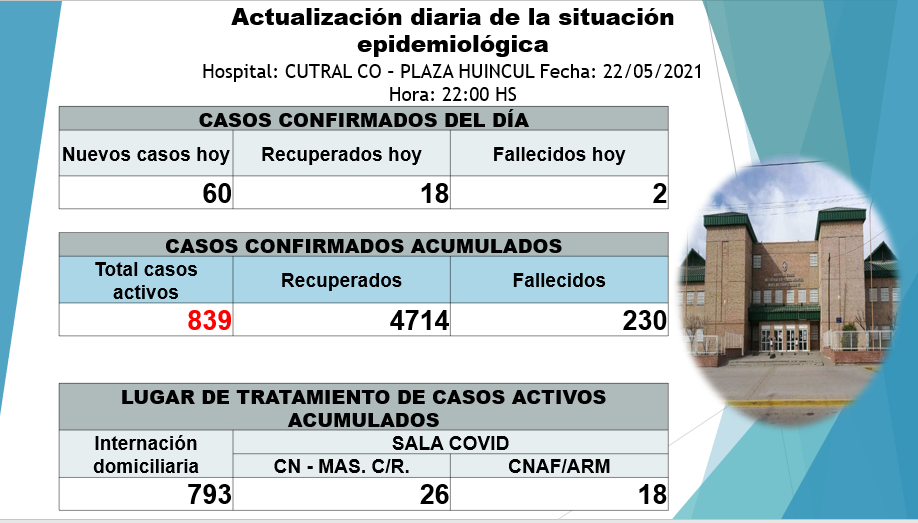 Además se informó que hay 60 contagios nuevos y que fueron 18 los pacientes que recibieron el alta médica. Eso deja la cifra de contagiados en 839.