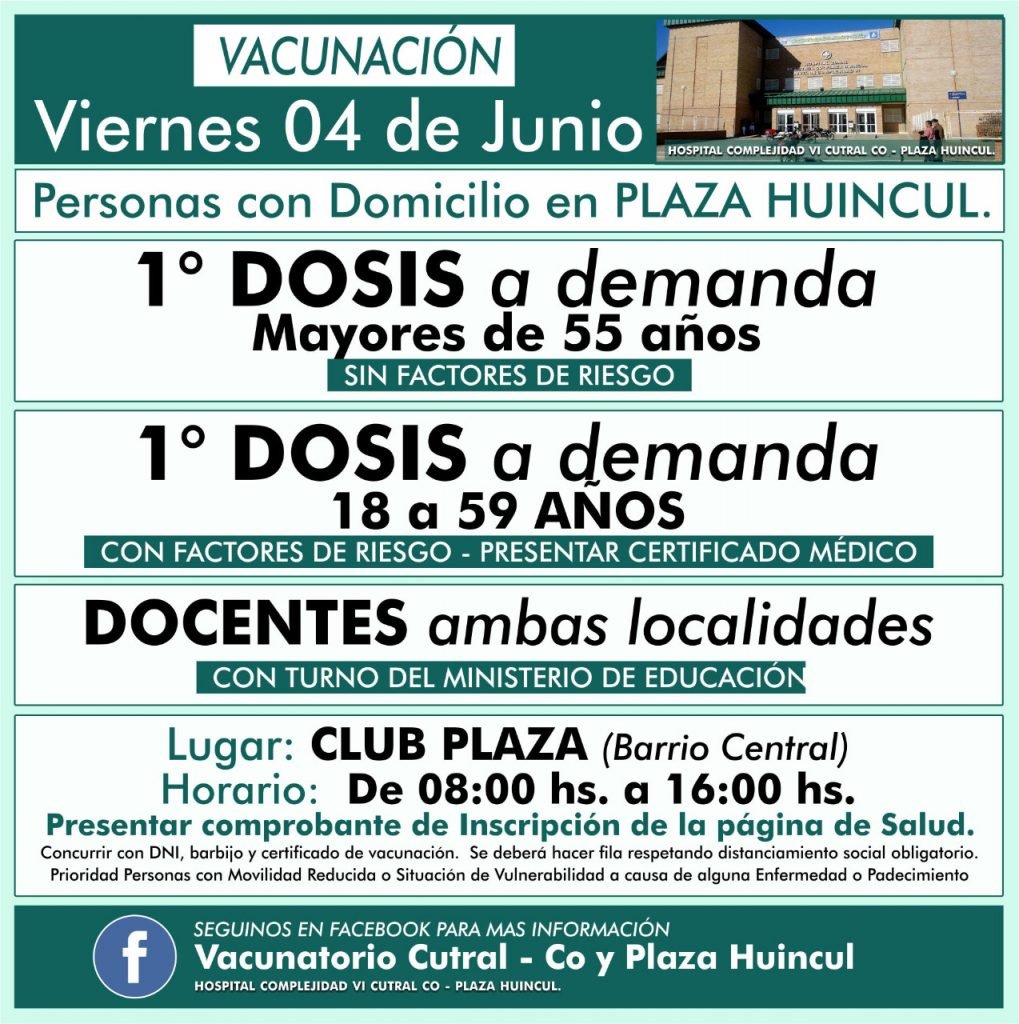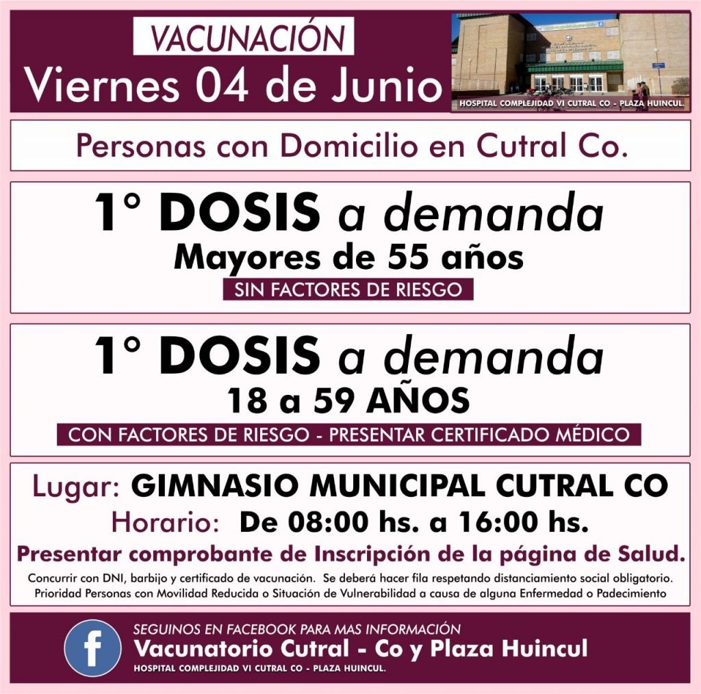La jornada de vacunación será el viernes 4 de junio, entre las 8 y las 16; y funcionará a demanda por orden de llegada. En Cutral Co será la primera dosis a mayores de 55 sin factores de riesgo, con domicilio en esta ciudad. Y la primera dosis a demanda, de 18 a 59 años, con factores de riesgo y con la presentación de certificados.