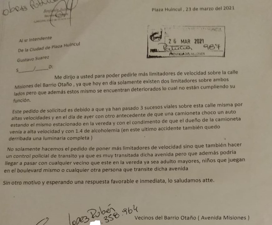 La nota fue dirigida al intendente Gustavo Suárez y rezaba “Me dirijo a usted para pedirle mas limitadores de velocidad sobre la calle Misiones del barrio Otaño, ya que hoy en día solamente existen dos limitadores sobre ambos lados pero que además estos mismos se encuentran deteriorados lo cual no están cumpliendo su función”.
