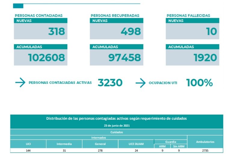 Este miércoles, el parte emitido a nivel provincial informó 318 nuevos casos de coronavirus y 10 personas fallecidas en todo el territorio provincial. Mientras que los pacientes recuperados fueron 498.