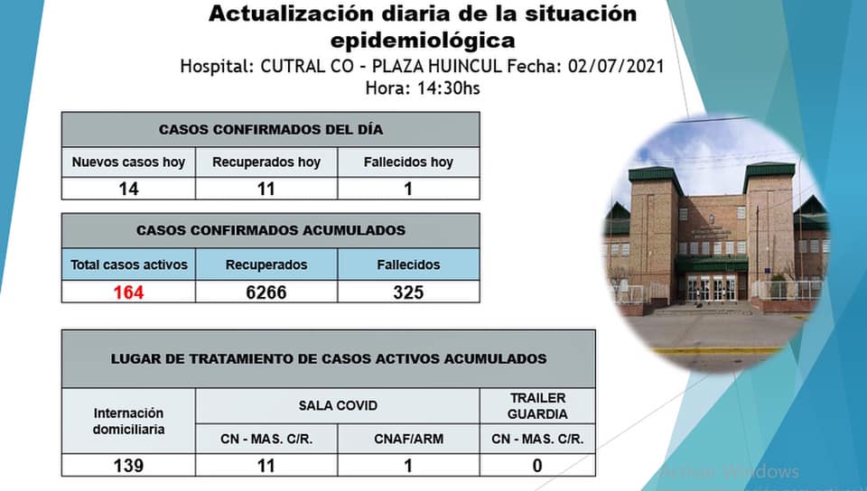 Además fueron 11 casos recuperados en Cutral Co y Plaza Huincul. Del total de los casos, hay 12 personas hospitalizadas y una de ellas cuentan con un respirador, mientras que 139 pacientes restantes permanecen con internación domiciliaria.