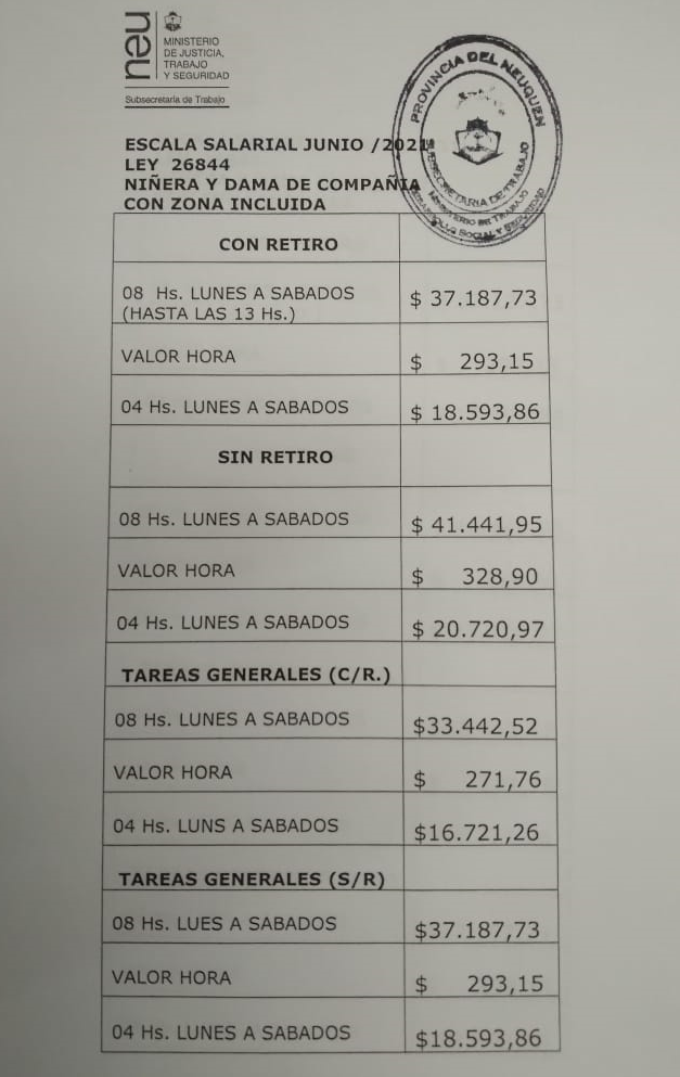 La escala salarial emitida por el Ministerio de Justicia , trabajo y seguridad de Neuquén fue actualizada en junio del 2021 y contempla los siguientes sueldos con zona incluida.