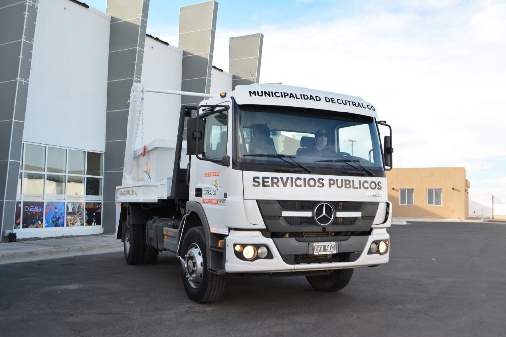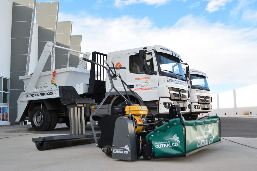 Hoy el municipio cutralquense hizo la entrega de nuevas unidades que se destinará al área de Servicios Públicos. Se trata de dos camiones portavolquetes, con diez volquetes cada uno, y una máquina cortadora de césped profesional.