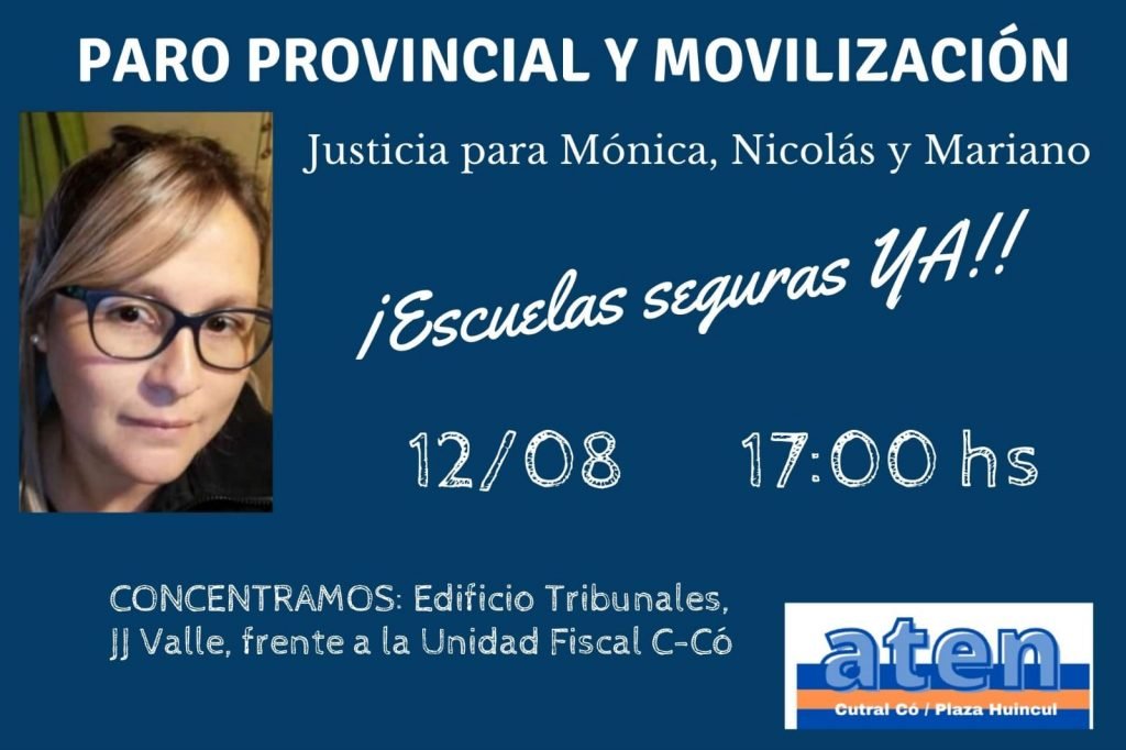 El gremio docente ATEN realizará un paro este jueves en reclamo de la seguridad en las escuelas. La movilización en Cutral Co será a las 17 en el edificio de tribunales.