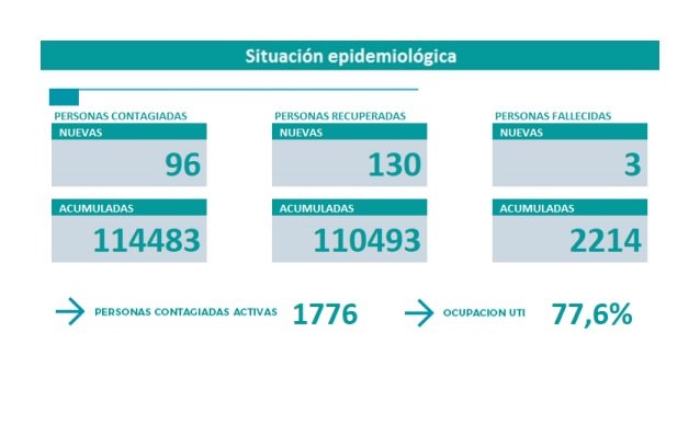 En cuanto a las personas recuperadas, superaron hoy a los casos de contagios y son 130. Para el caso de los casos activos en todo el territorio provincial son 1.776. Lo que se mantiene y sigue sin advertirse descensos es la ocupación de las camas UTI en toda la provincia y que se encuentra en el 77,6 %.