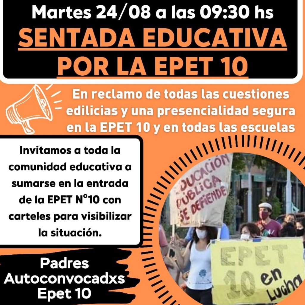 Los padres autoconvocados y algunos alumnos se sumaron hoy a la sentada programada a las 9.30 para visibilizar las problemáticas de la EPET 10; una de las tantas escuelas que ve imposibilitado el retorno a la presencialidad por cuestiones edilicias.