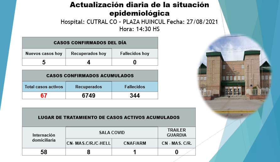 Además se reportaron 4 casos recuperados. El total de casos activos ascendió a 67 en Cutral Co y Plaza Huincul. Los pacientes internados en la sala covid del hospital de complejidad media son 9 de los cuales uno se encuentran con asistencia respiratoria mecánica.
