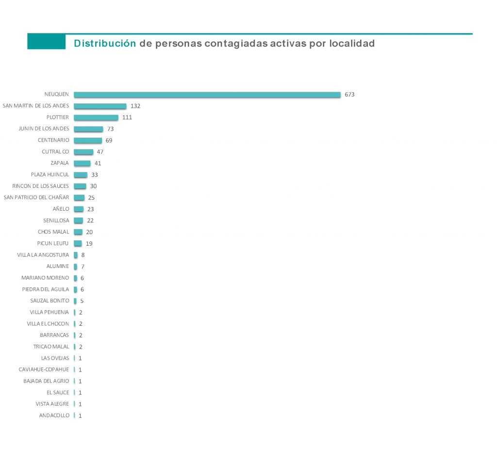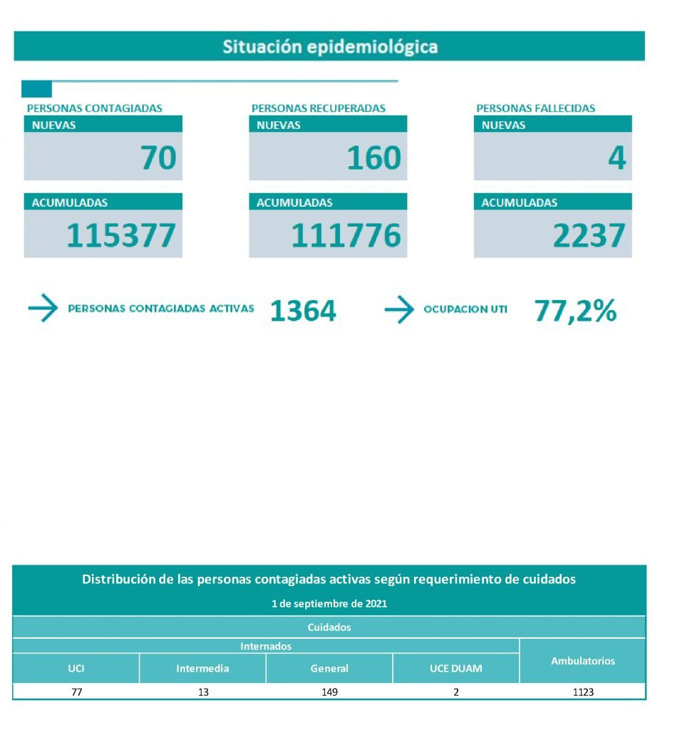 Además se detalló que hubo 160 personas recuperadas y que sigue bajando la cantidad de personas que cursan actualmente la enfermedad, hasta este miércoles eran 1.364. Finalmente el nivel de ocupación de camas de terapia intensiva sigue en el orden del 77%.