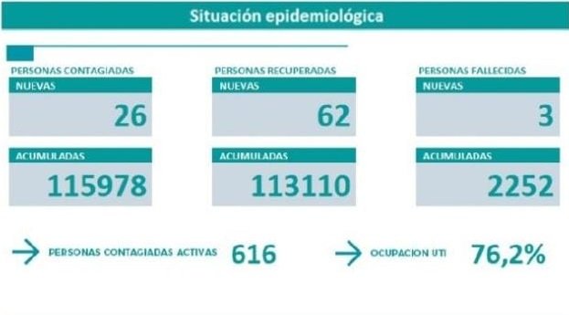 El número de recuperados fue 62 este lunes y los casos activos son 616. En cuanto a la ocupación de las camas UTI, en todo el territorio provincial es del 76,2 %.