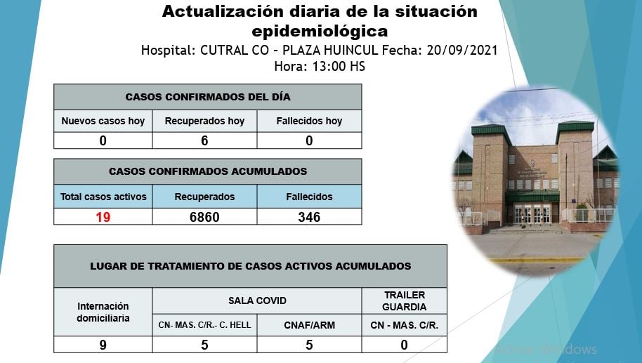 En el parte emitido por el hospital de Complejidad Media, sobre la situación epidemiológica de este lunes 20 de septiembre se informaron que no hubo nuevos casos y sin fallecidos de coronavirus.