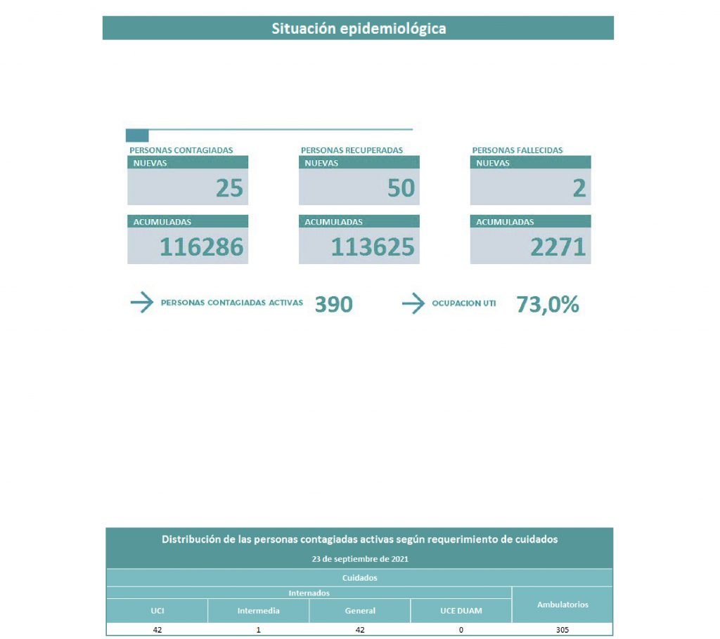 Se informó también que hubo 25 casos confirmados y que se recuperaron 50 personas. El dato del nivel de ocupación de las camas de terapia intensiva es del 73%