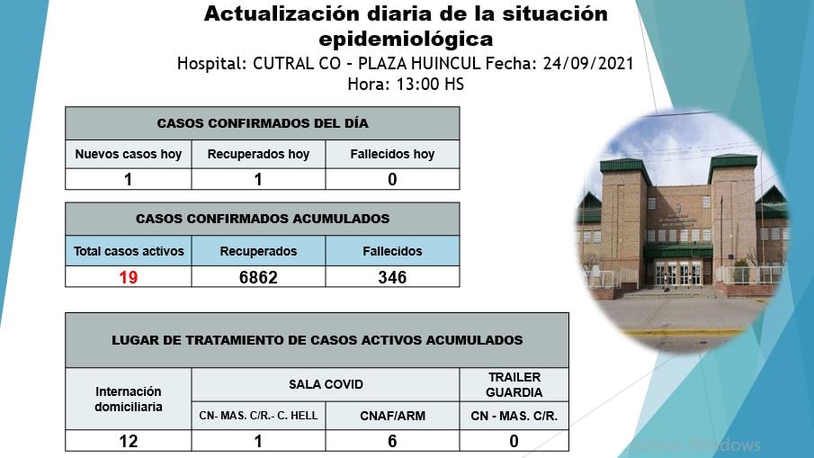 En el parte emitido por el hospital de Complejidad Media, sobre la situación epidemiológica de este viernes 24 de septiembre informaron que hubo un nuevo caso y sin fallecidos de coronavirus.