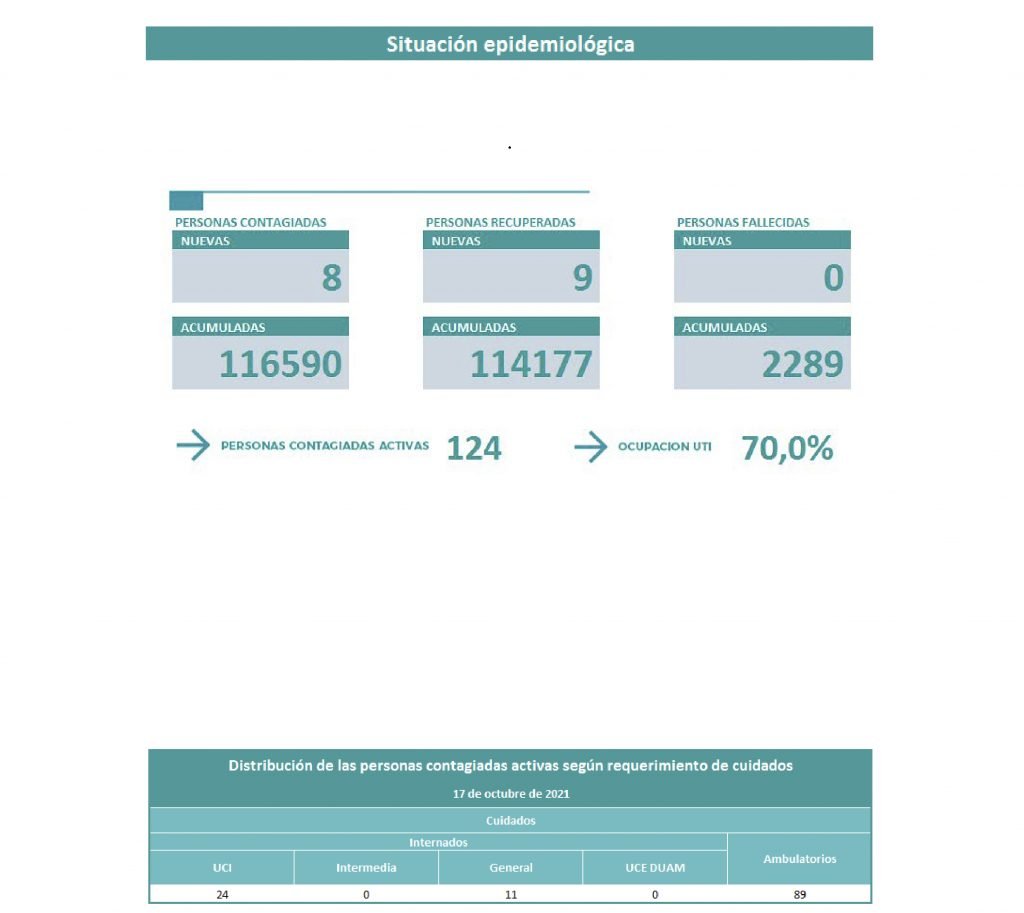 Con estos datos, hay 124 personas contagiadas y el nivel de ocupación de las camas de terapia intensiva es del 70%
