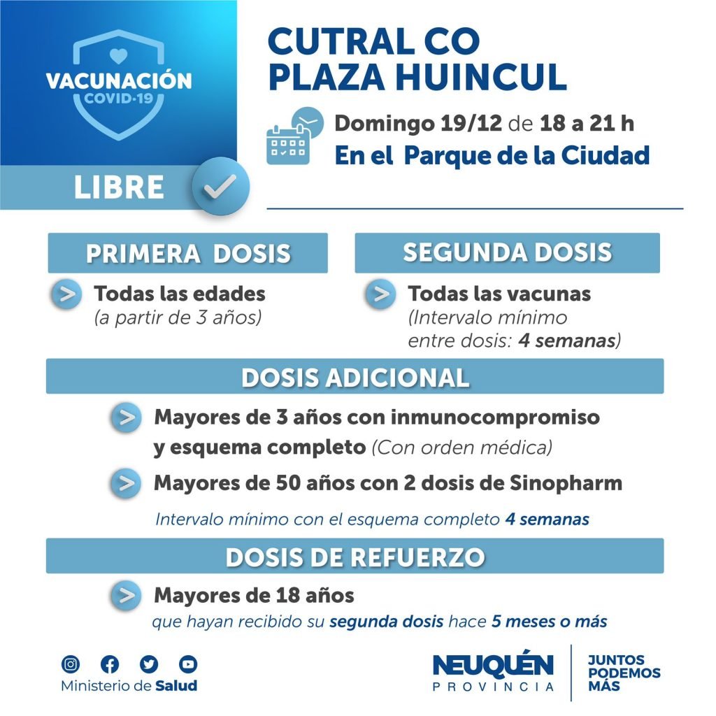 La campaña de vacunación contra el coronavirus se trasladará este domingo al Parque de la Ciudad de Cutral Co. El equipo de salud estará en el lugar desde las 18 hasta las 21.