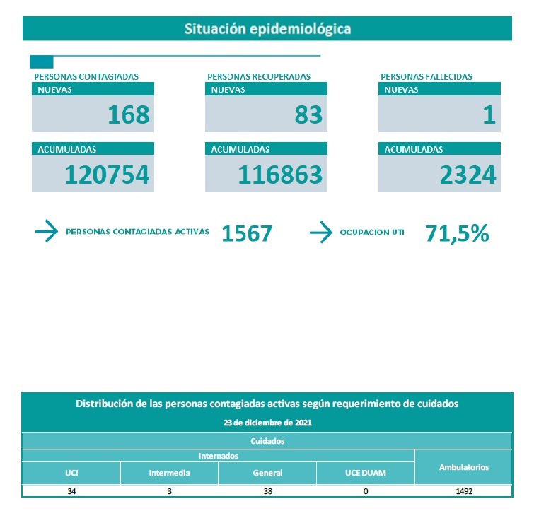Además se informó que se recuperaron 83 personas y que una persona falleció tras haber contraído la enfermedad. El nivel de ocupación de las camas de terapia intensiva se mantiene en 71%.