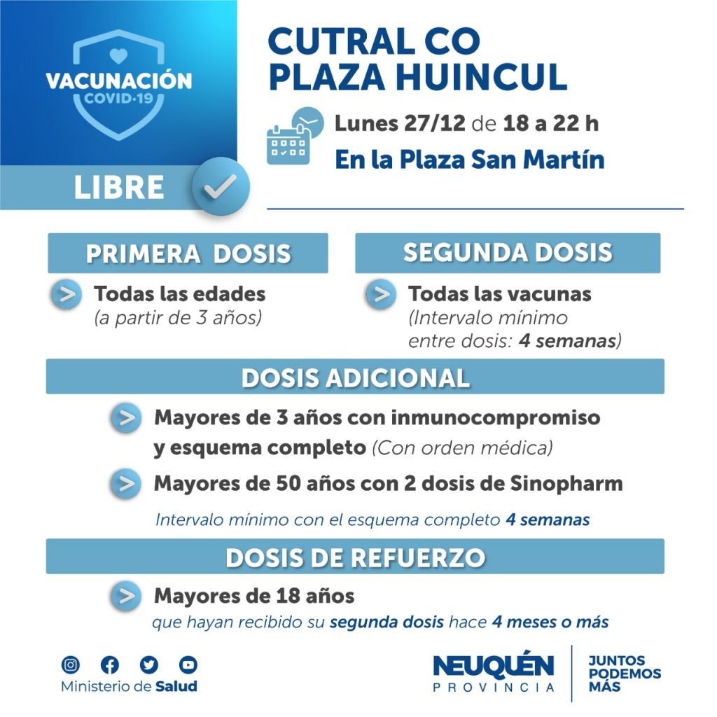 Hoy lunes y mañana martes, la campaña de vacunación se amplió y además habrá una locación en la plaza “San Martín” de Cutral Co, de 18 a 22. El dispositivo implica la colocación de todas las dosis y se incluye además, a las personas que tienen cuatro meses de diferencia entre la última dosis (en vez de cinco).