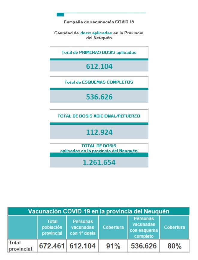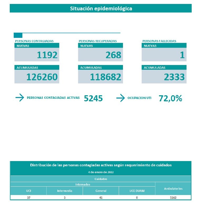 Los recuperados fueron 268 y los casos activos son 5.245 con una ocupación de camas UTI que se mantiene en el 72 %. Se informó por otra parte que, de las 37 personas internadas en terapia intensiva con diagnóstico positivo para COVID-19, el 57% posee esquema de vacunación COVID-19 incompleto (11% solo con primera dosis y 46% sin ninguna dosis).
