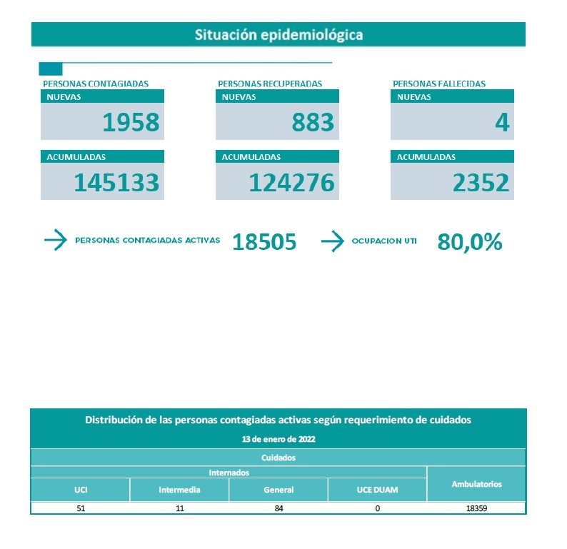 En la jornada de jueves 13 de enero, se reportaron 1958 contagios nuevos y se recuperaron 883 personas. Otro dato preocupante es que fallecieron 4 personas.