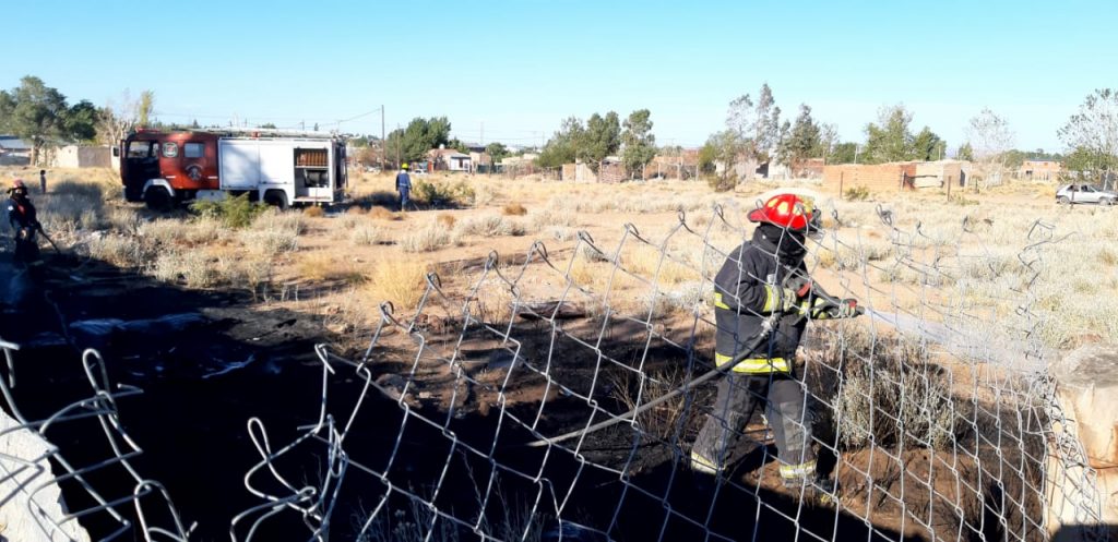 Un incendio de pastizales en la calle Chaco final, en el barrio Otaño de Plaza Huincul este sábado por la tarde. Los bomberos voluntarios huinculenses trabajaron en la extinción y lo controlaron rápidamente.