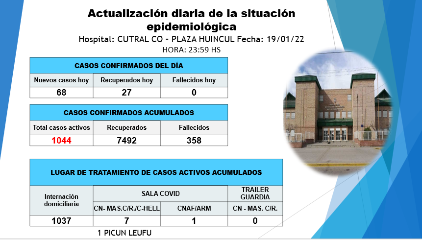 En cuanto a sector de internación de coronavirus, se informó que hay 8 personas internadas, una de ellas con requerimiento de asistencia mecánica respiratoria. Mientras que uno de los pacientes de sala covid es oriundo de la localidad de Picún Leufú.