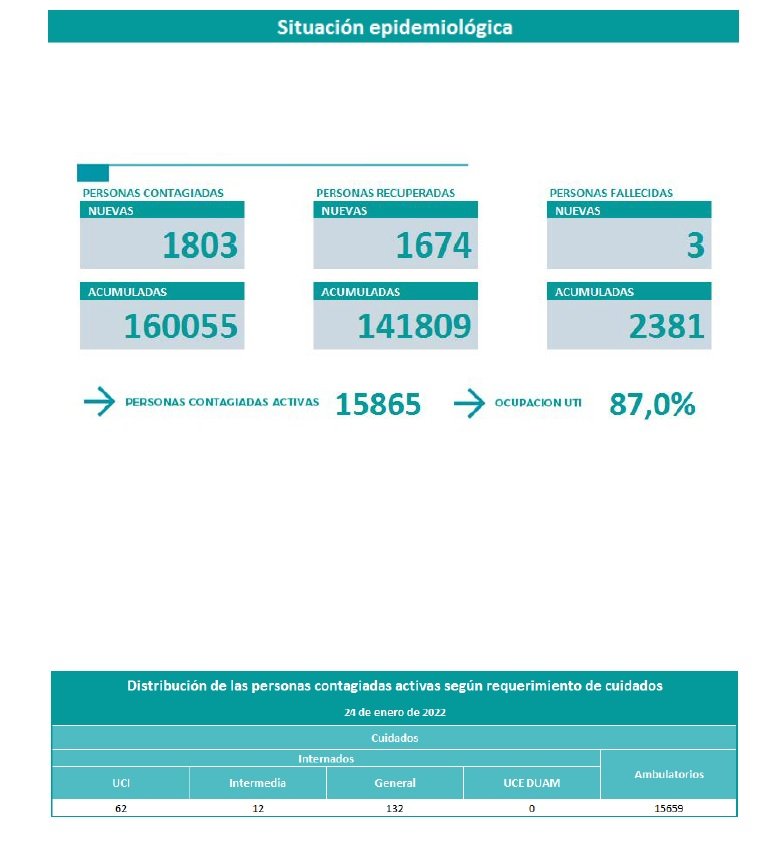 En este lunes, además la ocupación de camas de terapia intensiva se mantiene en el 87 %. En tanto, hubo 1.674 nuevas personas que se recuperaron.