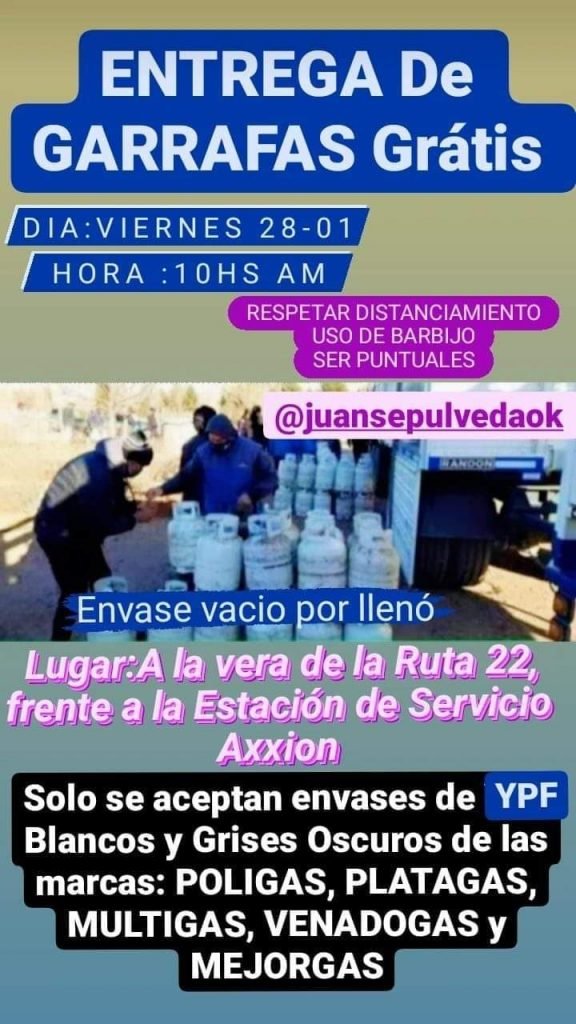 El camión estará estacionado frente a la expendedora de combustible situada en Primeros Pobladores e Yrigoyen, a la vera de la ruta 22, en Cutral Co. Los organizadores pidieron que las familias interesadas concurran con garrafas vacías blancas y grises oscuros de la empresa YPF y de las marcas Poligas, Platagas, Multigas, Venadogas y Mejorgas.