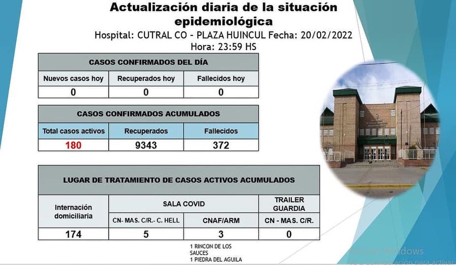 En Cutral Co y Plaza Huincul hay ocho pacientes internados, tres de ellos en el área de terapia intensiva, según se informó en el reporte que corresponde al domingo 20 y que tiene hora de cierre las 23:59.