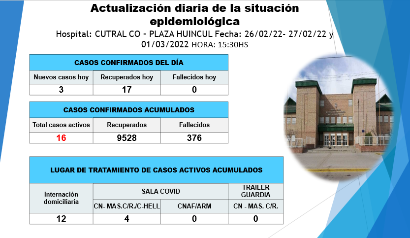 El informe del hospital zonal indica que en los últimos cuatro días solamente hubo 3 personas con hisopado positivo, que se recuperaron 17 personas y no hubo fallecidos.