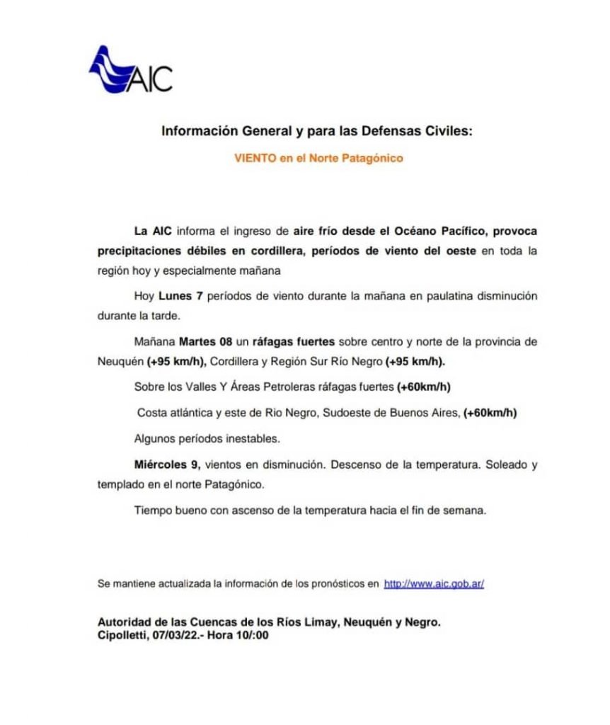 La Autoridad Interjurisdiccional de Cuencas –AIC- advirtió sobre el viento para esta tarde con ráfagas que pueden llegar a los 95 kilómetros por hora.