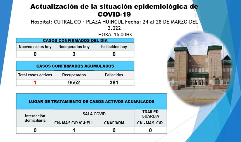 Desde el sector de epidemiología del hospital Complejidad Media informaron que en la comarca solo queda un caso activo y que en los últimos cinco días se registraron 3 casos recuperados y sin fallecidos.