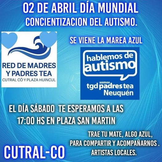 La jornada organizada por la Red de madres y padres TEA junto a Hablemos de Autismos (somos tgd padres tea Neuquén) está pautada para el sábado desde las 17 horas. Los participantes podrán llevar su mate y algo azul.