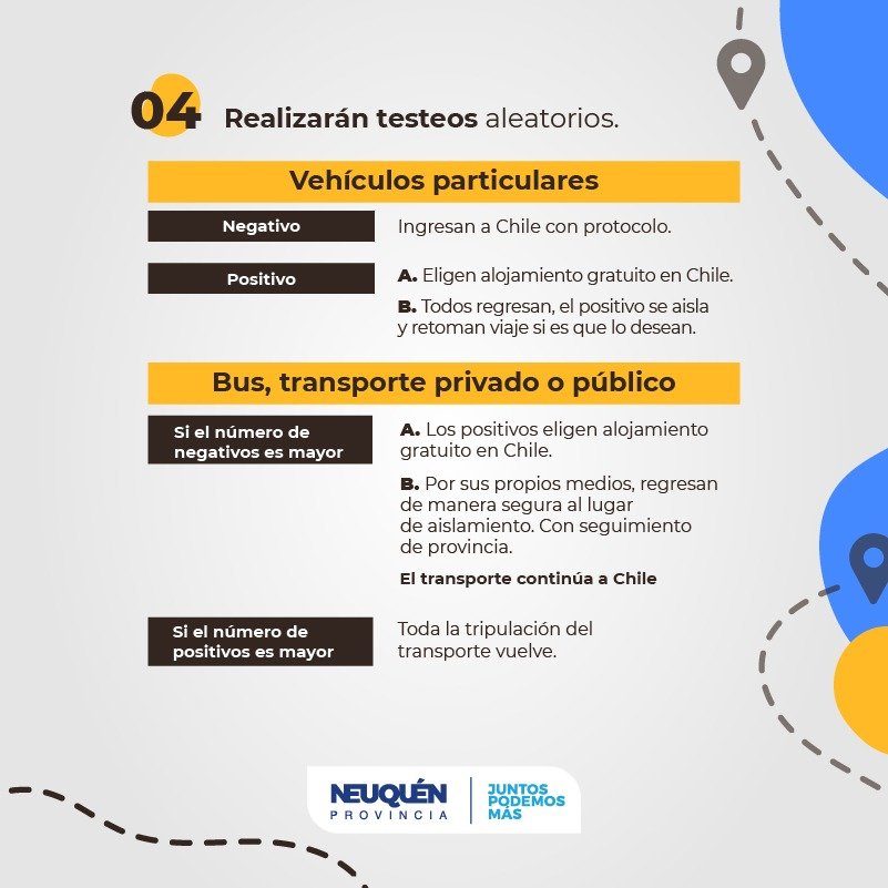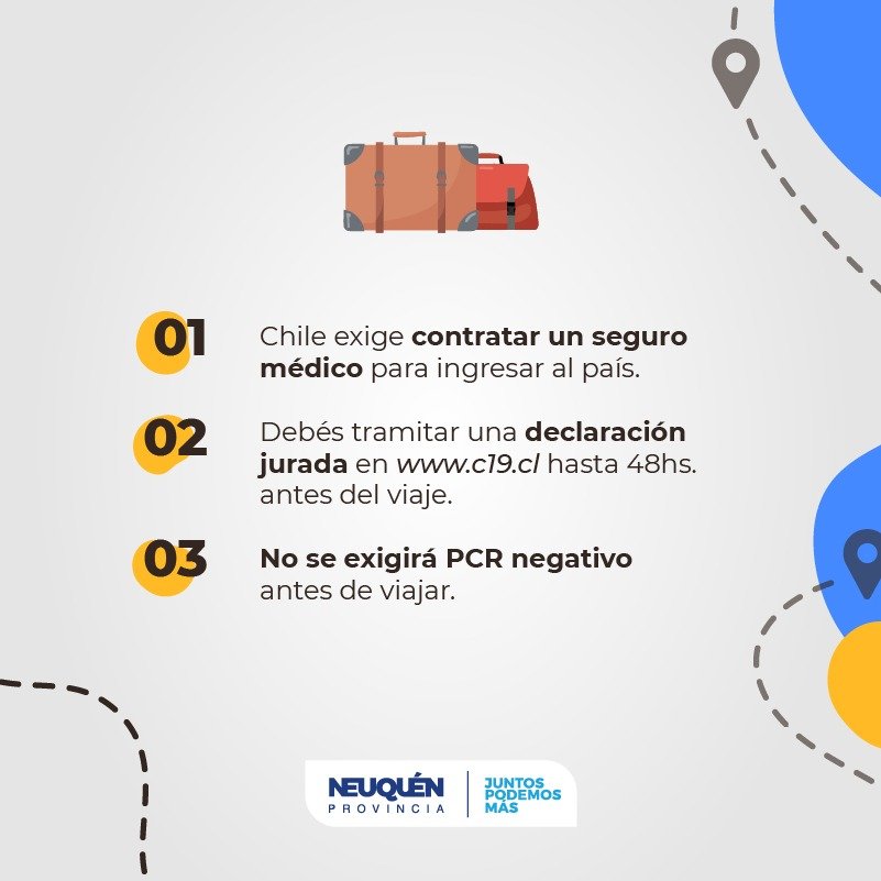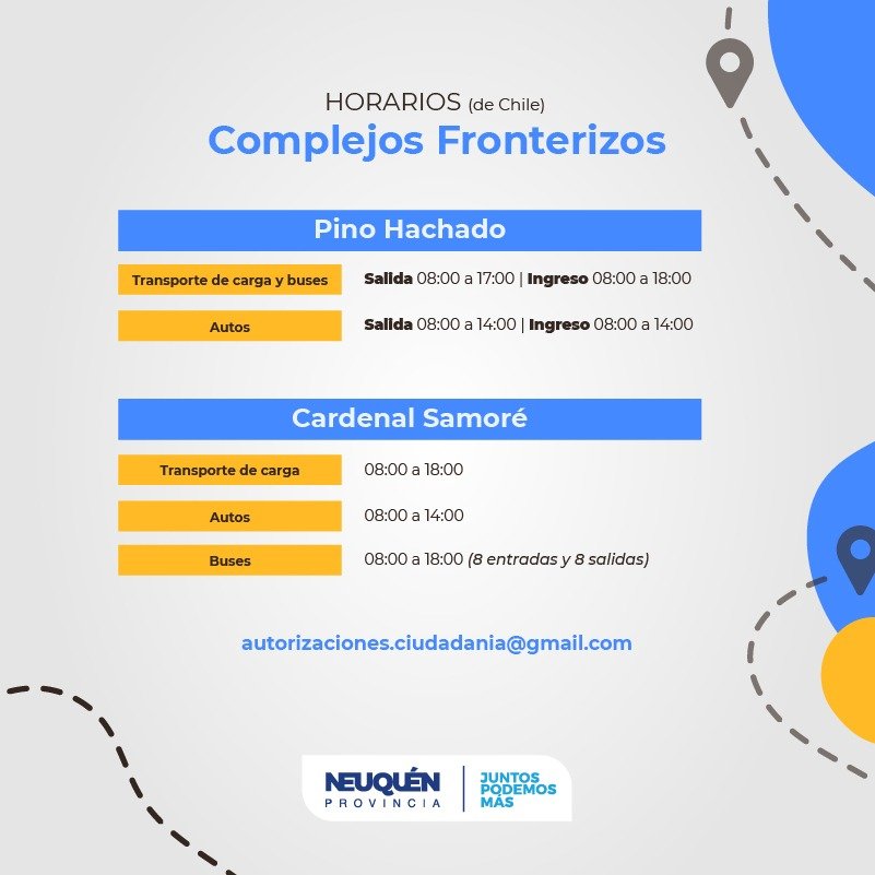 Desde el gobierno provincial se explicó cuáles son los requisitos que se deben tener en cuenta para cruzar a Chile. Los horarios en los que estarán habilitados son: para el caso de autos: salida 8 a 14 – Ingreso de 8 a 14. Transporte de carga y buses: salida: 8 a 17 – Ingreso de 8 a 18.