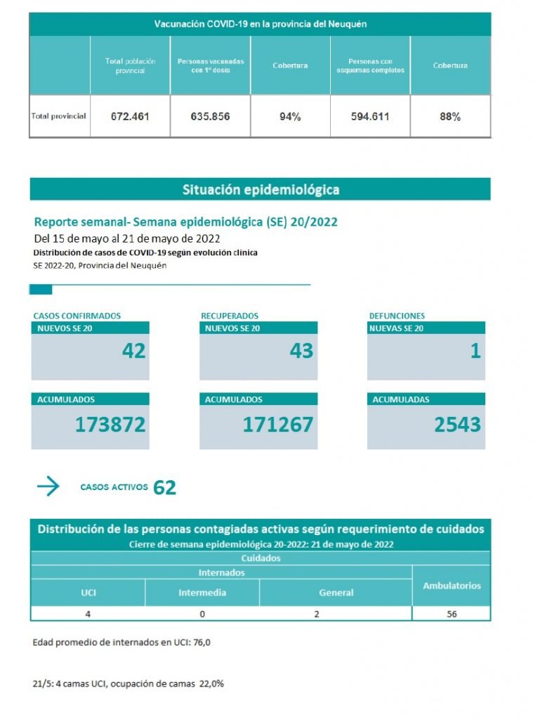 Los datos suministrados por la provincia indican que hubo 42 nuevos contagios de coronavirus mientras que 43 personas se recuperaron en los últimos 7 días.