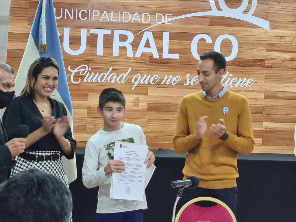 Valentino, que tiene 13 años recibió hoy un reconocimiento en el Concejo Deliberante de Cutral Co. Se trata de creador y ganador para representar a la provincia en la categoría “videominuto” para los Juegos Nacionales Evita y que se llamó “Todos somos uno”.