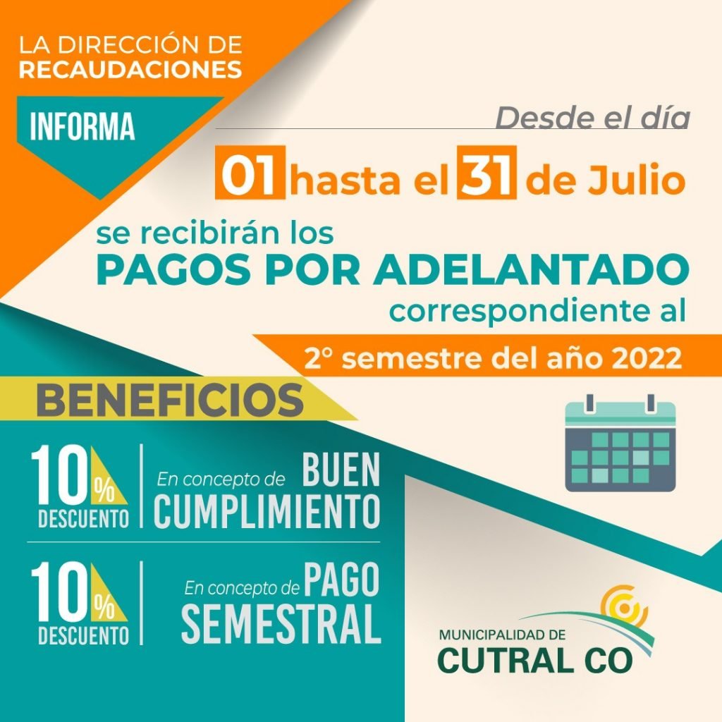 En Cutral Co se puede acceder desde el 1 hasta el 30 de julio a los beneficios de descuento por pago anticipado del segundo semestre del año 2022 para las tasas e impuestos municipales.