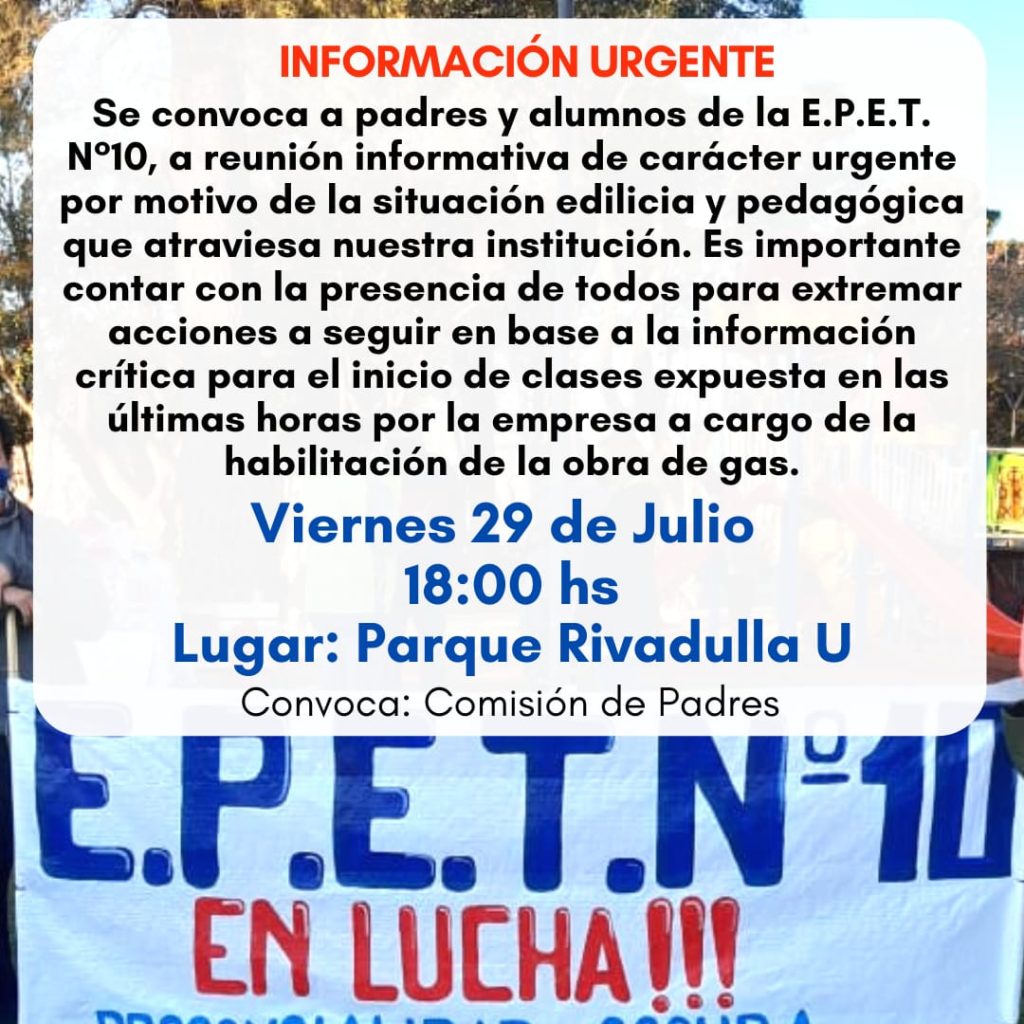 La comisión de padres autoconvocados de la EPET N° 10 de Plaza Huincul convocó a las familias de las y los estudiantes a una reunión para este viernes a las 18, en el parque Rivadulla -la U- ante la situación edilicia.
