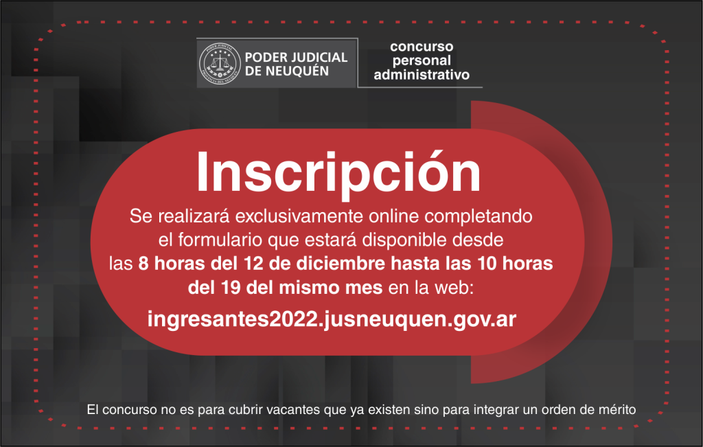 Desde el Poder Judicial se informó que en el mes de diciembre abrirá la inscripción de postulantes para personal administrativo. Se realizará exclusivamente online completando el formulario que estará disponible desde las 8 horas del 12 de diciembre hasta las 10 horas del 19 del mismo mes en la web: ingresantes2022.jusneuquen.gov.ar.
