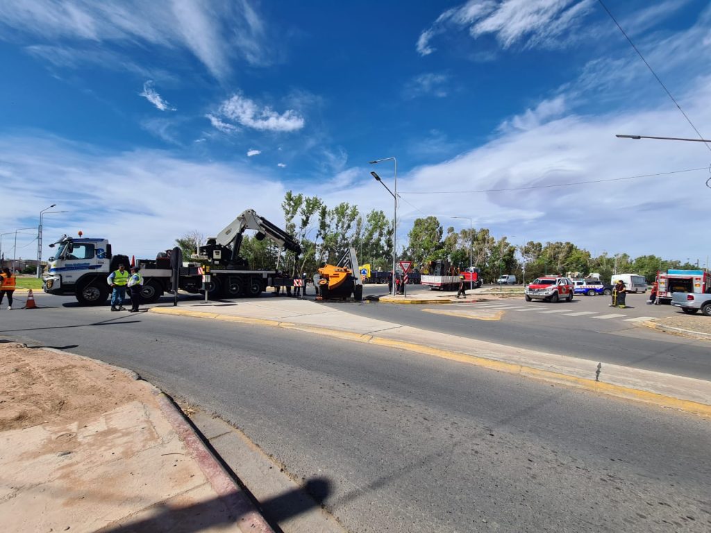 La pesada pieza cayó sobre la mano de acceso a la vía nacional desde la calle 9 de Julio en Plaza Huincul. El vehículo pesado transitaba desde el oeste a este y al atravesar la rotonda que está en el límite entre ambas ciudades, y retomar la Ruta 22, por razones que se desconocen se cayó sobre el pavimento.